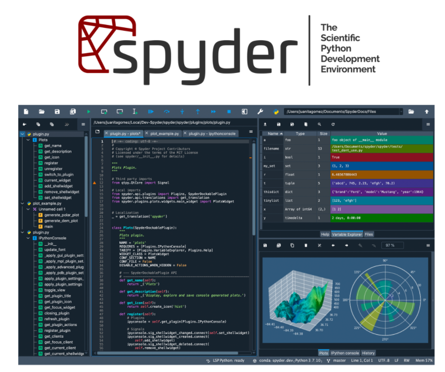 기본적인 Editor, debugger 기능 외에 변수 탐색기(Variable Explorer), 시각화 Ploting 기능 등 데이터 사이언스에 필요한 도구들을 제공하는 IDE입니다. 데이터 사이언티스트 친화적 IDE라 할 수 있겠습니다.